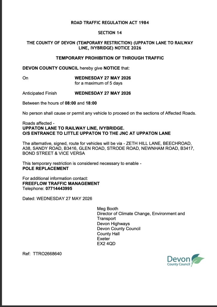 Temporary Traffic Notice- Uppaton Lane to Railway Line, Cornwood
